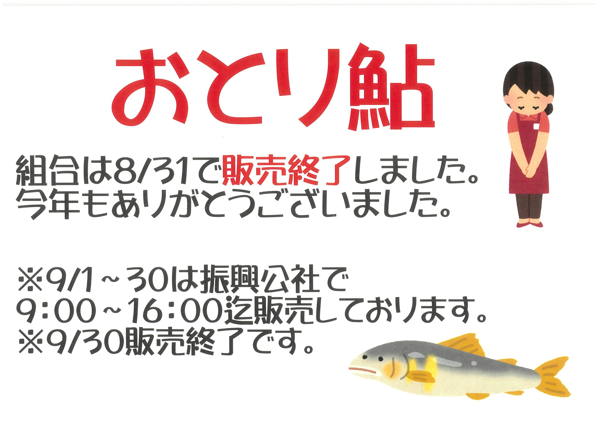 おとり販売のお知らせ(゜))<< user約 1 分お知らせ 今年も沢山のご購入ありがとうございました♪ 8/31(水) 10:00を持ちまして当組合でのおとり売り販売は終了致しました。 まだまだ釣りできます! 9/1(木)~9/30(金)まで振興公社さんで販売しておりますので、そちらでお買い求めください。 よろしくお願いいたします。 URL : TRACKBACK URL :