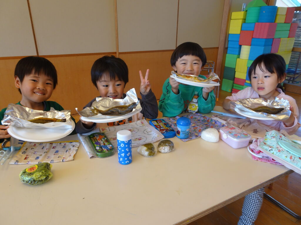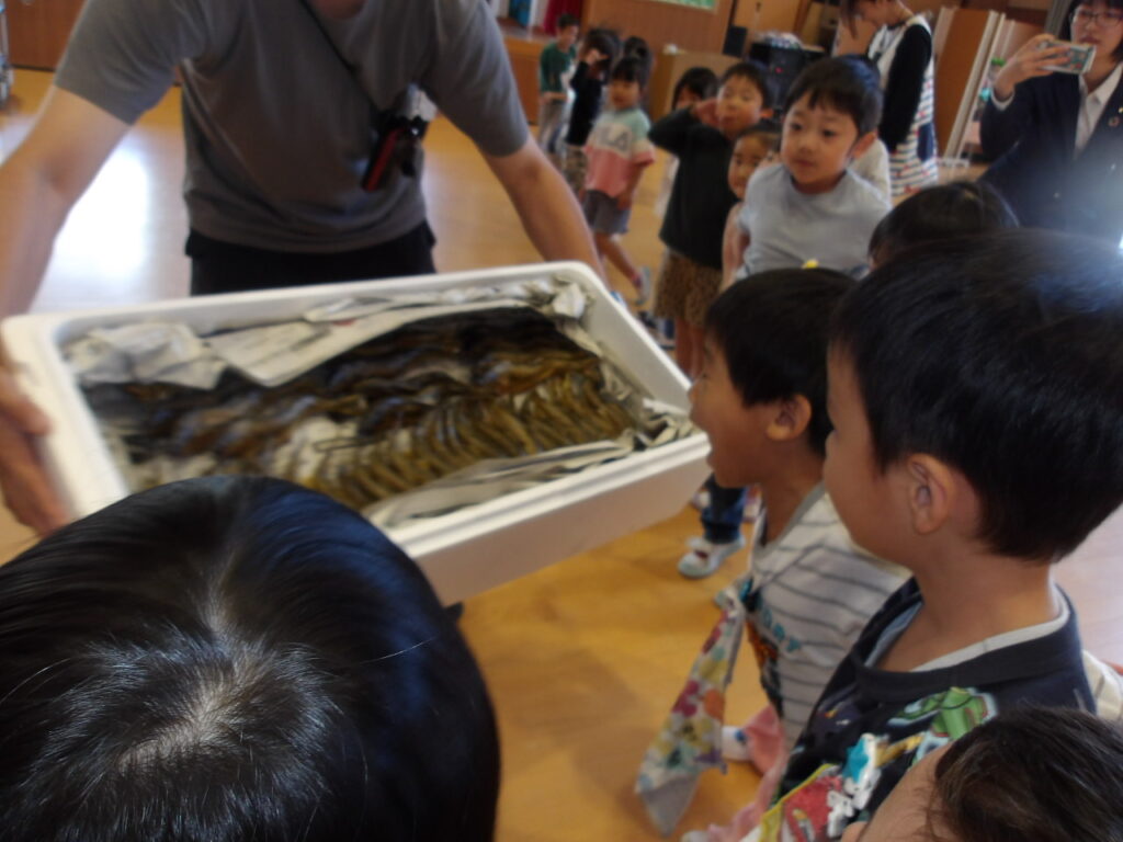 10月15日(水)組合事務所で朝から理事数名で鮎を焼き、お昼にみなみわかば幼稚園の園児51名に鮎の塩焼きを届けて来ました。